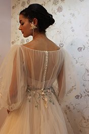 Renkli çiçek süslemeli transparan gelinlik modellerimizden kayık yakalı kabarık gelinliğimiz uzun kabarık kollu, ve uzun kuyruklu.